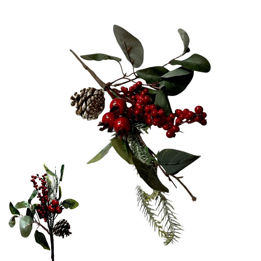 Ova dekorativna božićna grančica izrađena je s posebnom pažnjom prema detaljima, od materijala koji vjerno oponašaju pravu zimzelenu granu. Zahvaljujući realističnom izgledu, božićna grana s bobicama i češerima postaje nezaobilazan dio svake blagdanske dekoracije.