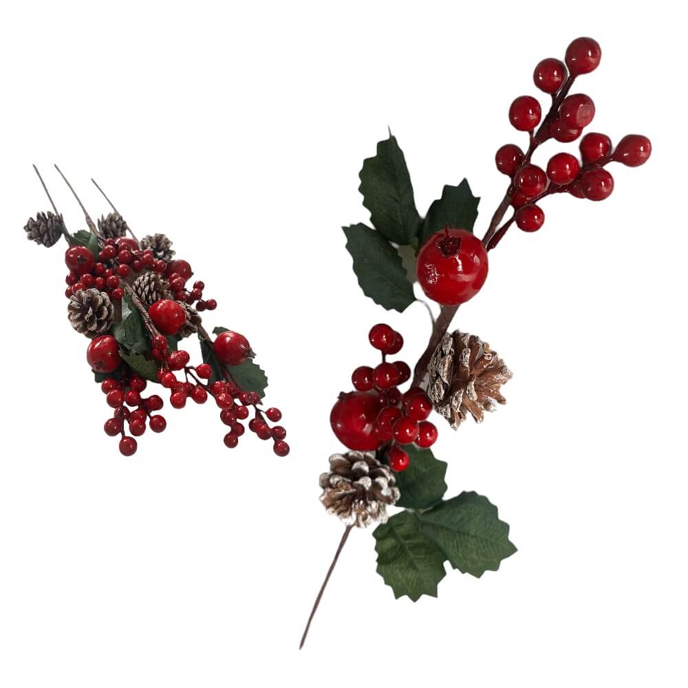 Na grančici se nalaze bobice u jarko crvenoj boji, koje podsjećaju na božikovinu – tradicionalni simbol Božića i zimskih blagdana. Neke od grana dodatno su ukrašene malim češerima te posipane umjetnim snijegom, čime se stvara čaroban dojam mraza i zimskog pejzaža.