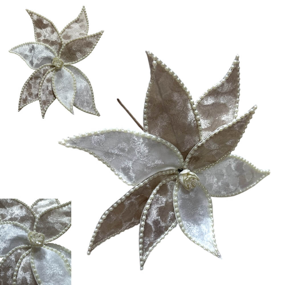 Božićni cvijet izrađen od bogate, kvalitetne tkanine donosi elegantan, zimski i visokokvalitetan izgled svakom aranžmanu. Zahvaljujući svojoj bež, zlatnoj, srebrnoj ili klasičnoj božićnoj boji, ovaj ukras savršeno se uklapa u najrazličitije blagdanske stilove — od modernog do rustikalnog.